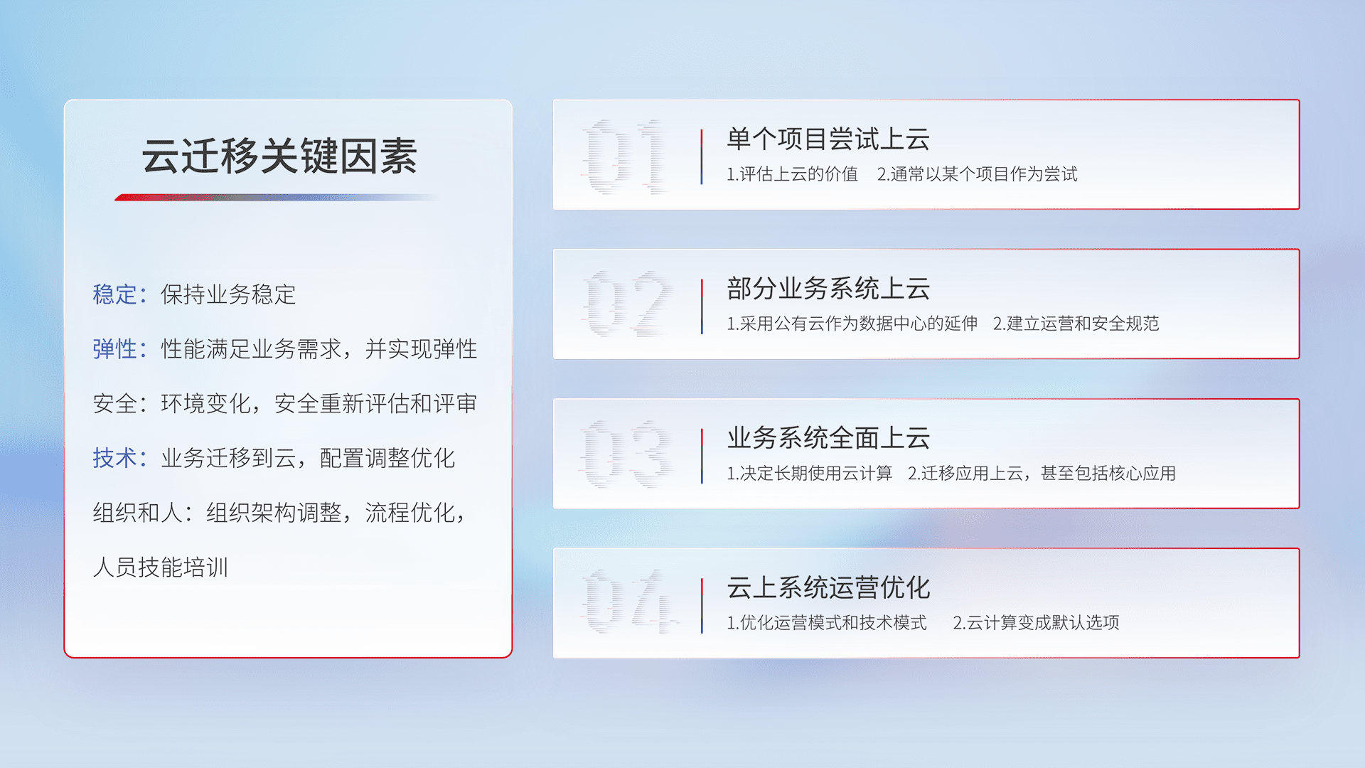 结合实际业务,,,,从规划设计、、、云平台选型、、、、云原生改造、、、数据迁移、、、集成交付,,,迁移全过程为客户识别最佳上云路径,,做好风险识别管理,,设计网络架构、、、身份权限、、、、安全审计合规、、、、操作审计、、、日志审计、、、监控告警策略、、、、多站点容灾设计等,,对云上基础设施进行整体规划,,,,提升IT治理水平,,,,以满足弹性、、、、高可用、、高性能的需求。。。。
