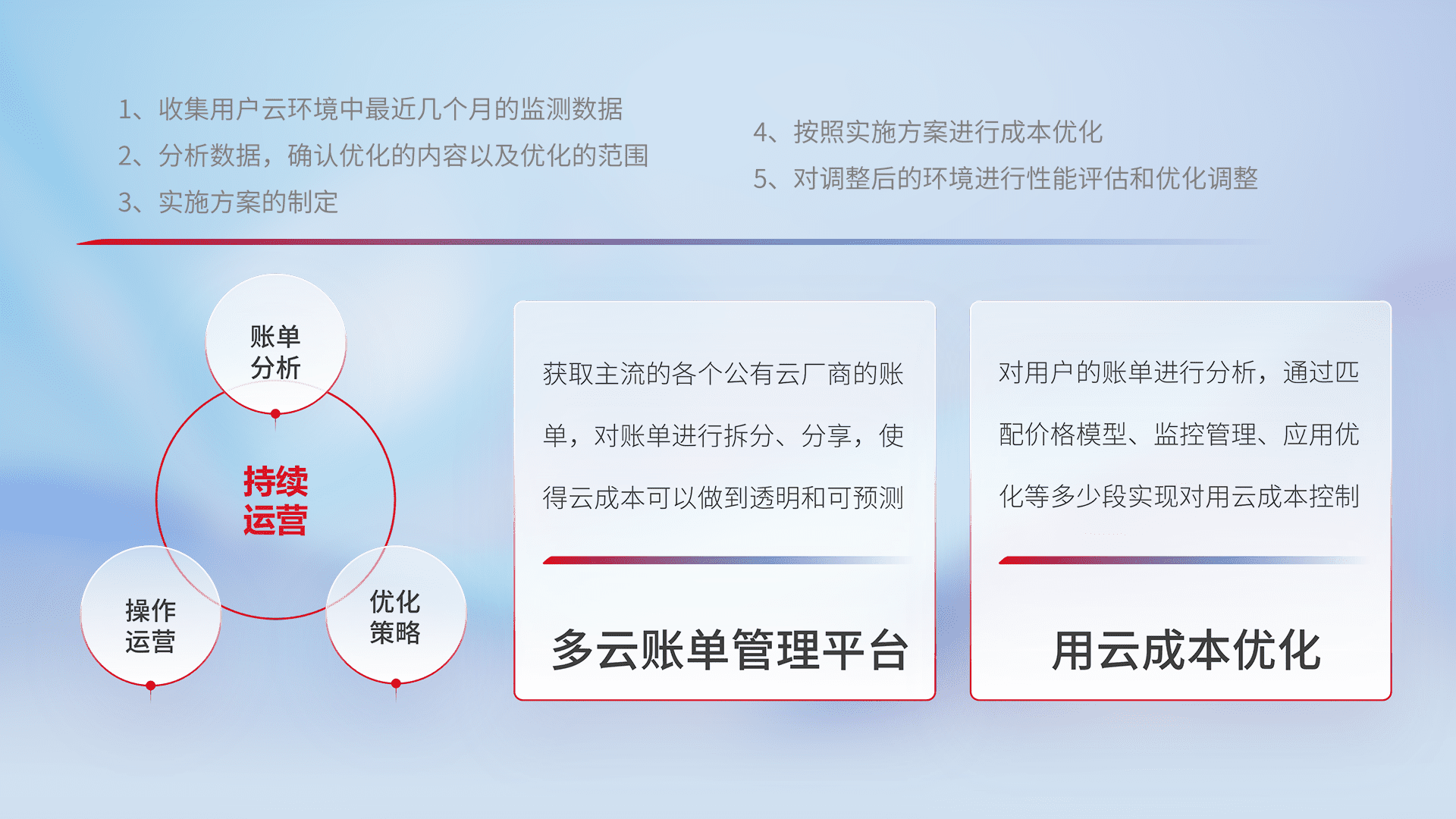通过多云纳管,,以统一的资源数据模型把客户的云资源进行抽象和封装,,进而实现对多云资源的统一操作,,,保障云资源管理的可靠性、、稳定性与可用性。。量身定制化运维内容,,,,配置、、、开发运维、、补丁管理、、备份、、、、监控、、、认证和访问管理、、审计和日常巡检等,,保障在用云过程中的可靠度,,稳定度以及高可用率。。。。
